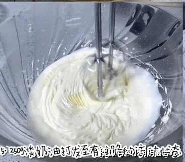 接下来就是打奶油啦,把奶油用电动打蛋器打发至5.6成,即流动状态就好啦,加入刚刚拌好的抹茶液一起搅拌均匀,倒入冰格中,放入冰箱中冷冻一晚