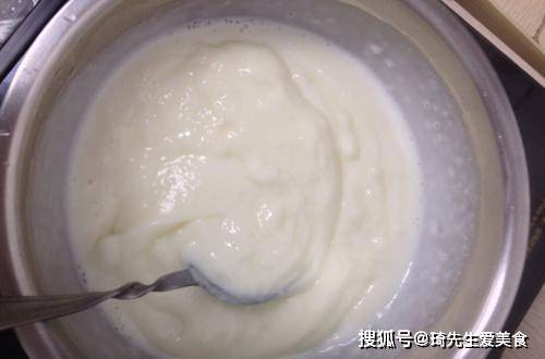 然后就可以倒在锅里面来煮了,而且也建议大家准备一口不粘锅,并且在煮的时候,也要用小火慢慢的煮,而且还要边煮边搅拌,等到煮至非常黏稠的状态时就可以关火了。然后准备一个保鲜盒,在保鲜盒里面铺上一层保鲜膜,把牛奶糊倒在容器里边。
