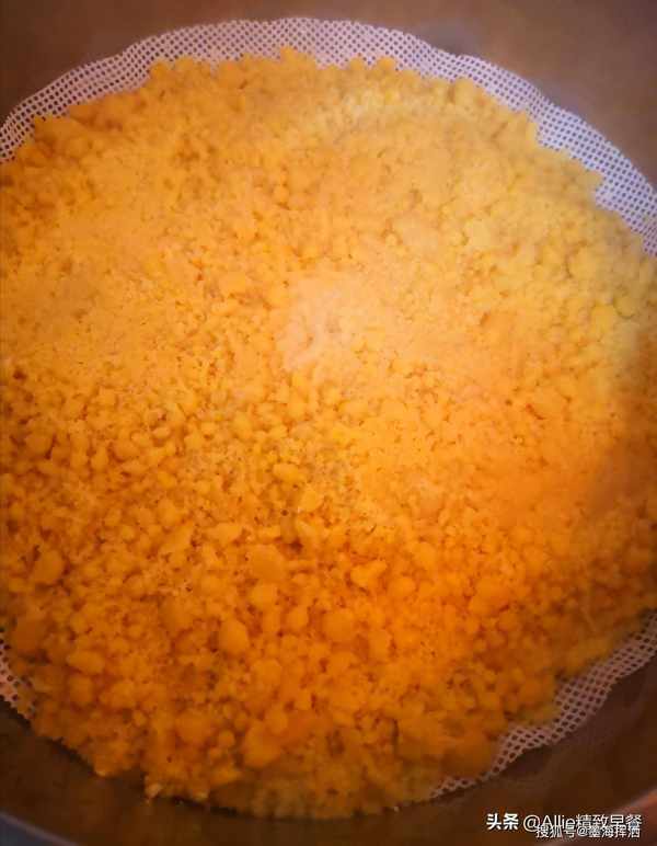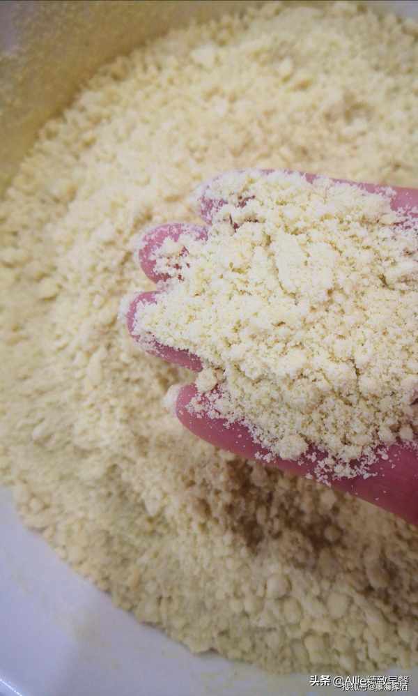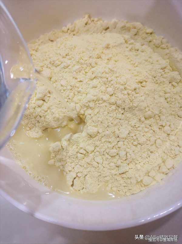 搅拌至黄色米粉结成小疙瘩,米粉中留有少量干粉。