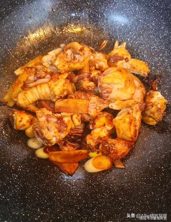 倒入鸡块,加入适量老抽上色,翻动数次,使鸡肉均匀沾上。