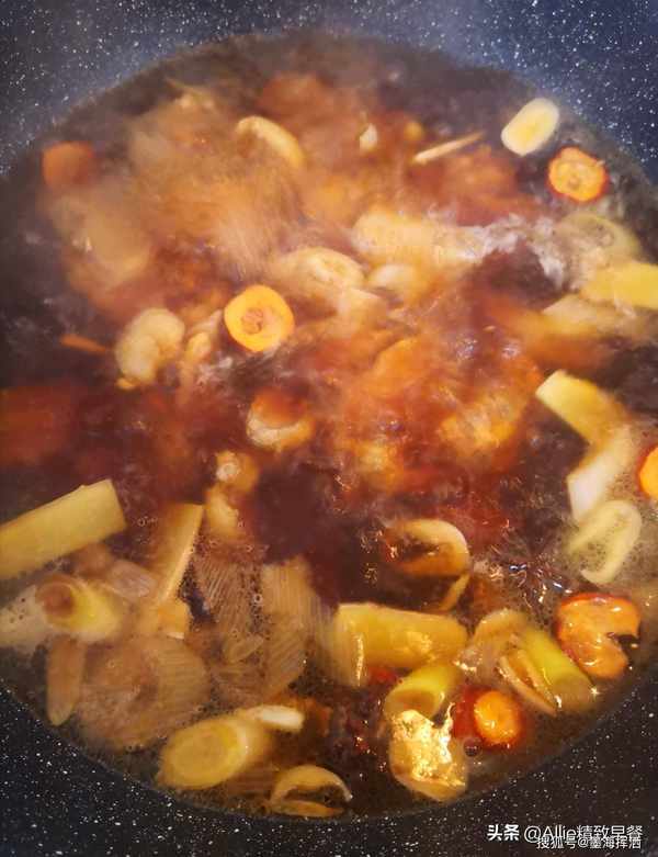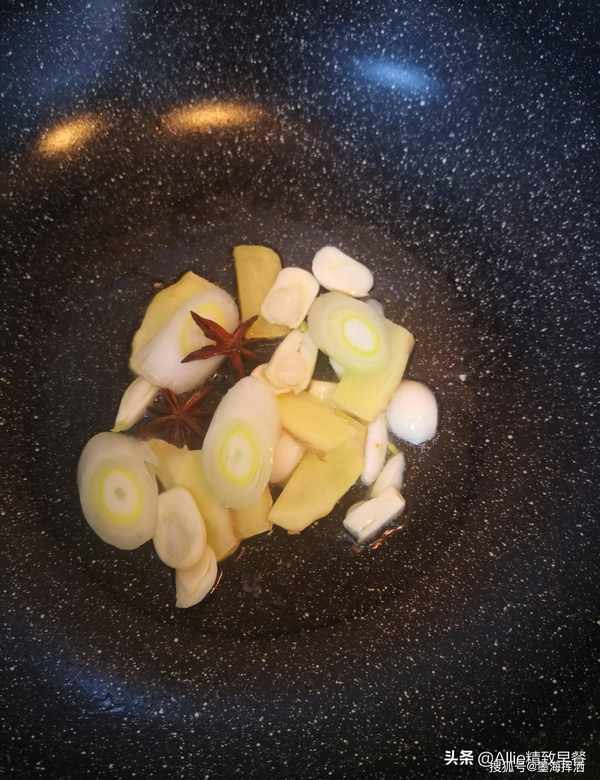 热锅冷油,放入姜、葱、蒜、八角炒香。