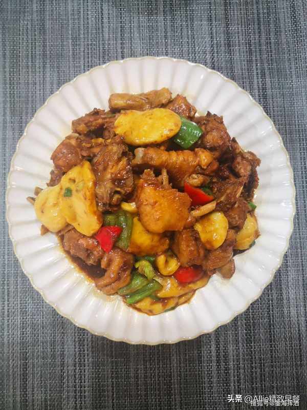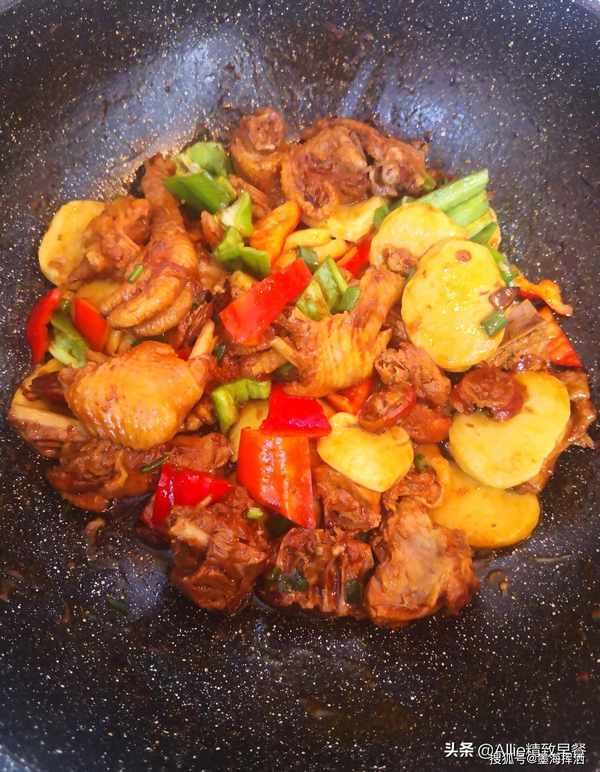 煮至鸡肉变软不烂,倒入年糕,加青红椒调色,葱花提味。