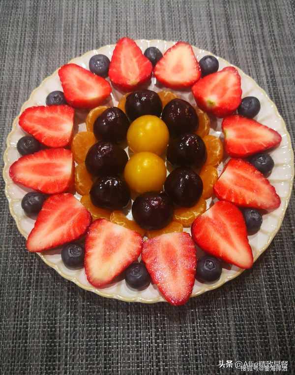 蓝莓、草莓、橙子、樱桃、黄色西红柿。