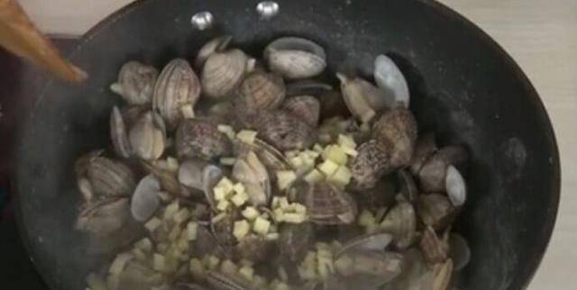 2、火上热锅,不放油直接放入花蛤干炒,待花蛤壳微开,吐出大量的鲜汁水时,放入葱、姜、蒜、继续翻炒;