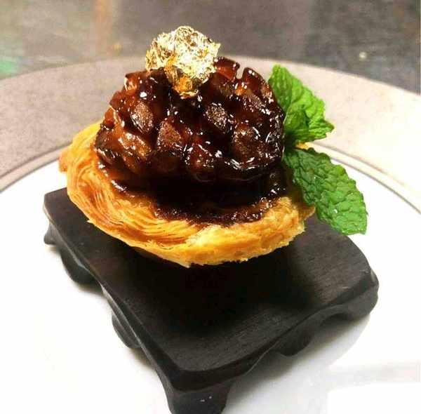 蛋挞1个、鲍鱼一只、红酒汁(红皮洋葱、红酒、白兰地、黄油、盐、黑胡椒粉)
