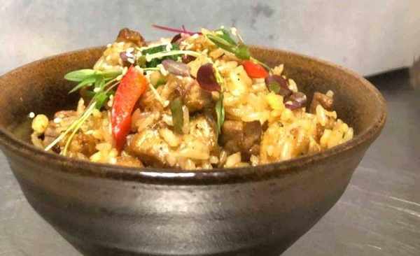 鹅肝粒50克、和牛粒50克、大米饭180克、蛋黄1个、秋葵1只、红甜椒20克、菜苗2克、黑椒汁20克