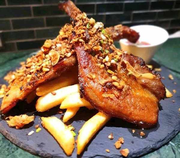 猪排2只、蒜酥、油葱酥、葱花、薯条100克、盐、糖、白胡椒、酱油、蜂蜜