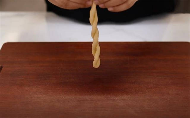 3.面剂子简单的搓几下揉均匀,然后直接搓成细长条,搓好之后我们双手往反方向再搓一下,捏住两端提起来它就会缠绕在一块。