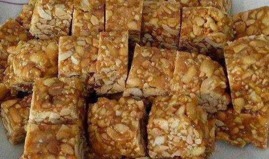 花生芝麻糖是小时候常吃的一道美食,那时候超市里还没有琳琅满目的零食,小孩儿买吃的也多是手艺人走街串巷卖的。老爷爷等着自行车,两边挂的篮子里装着糖葫芦或者芝麻糖,或者是糖稀,很受孩子的喜欢。