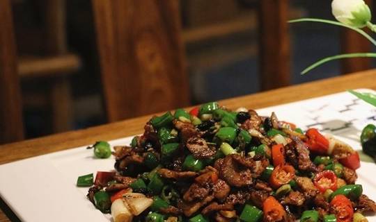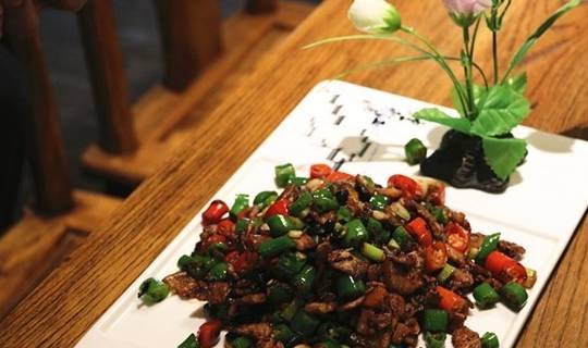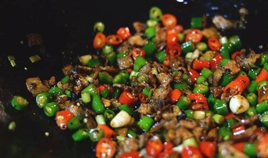 主料:土猪肉200克,青红美人椒各100g。配料:黑豆豉少许;蒜米和大蒜白少许;生抽、耗油、老抽少许;白糖少许。