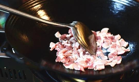 1.讲土猪五花肉切块,放米酒少许煮熟。待水分蒸发完放油,让其出油并捞出。