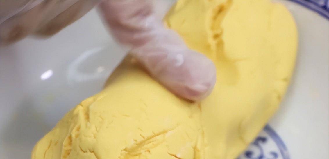南瓜蒸熟后,放入大碗中,捣成细密的南瓜泥,加入适量粘稠的粗面粉,边加边搅拌至呈片状,然后揉成面团。