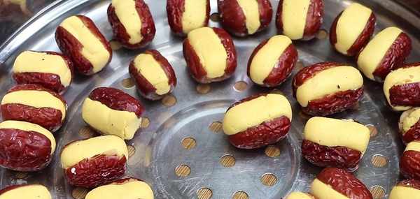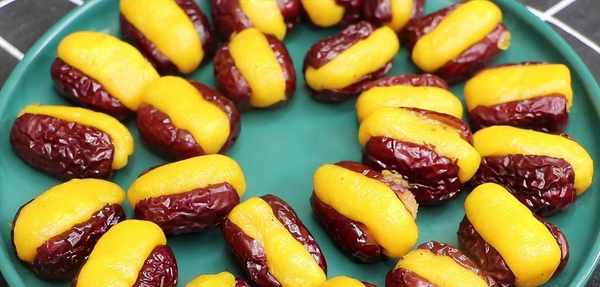 准备适量大枣,在碗中摇匀洗净,控水捞出待用,准备南瓜一块,去皮去果肉,切成薄片装盘,然后放入蒸锅中蒸熟。
