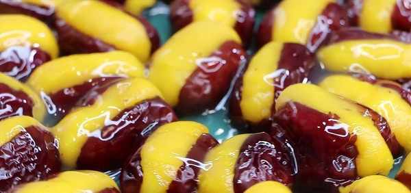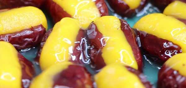锅中加入半容器水和30克白糖,将白糖用中火煮沸,然后加入事先在水中准备好的淀粉,快速搅拌使汤变浓稠,关火倒入水。我们做的红枣。这样,用红枣做成的南瓜球就做好了。