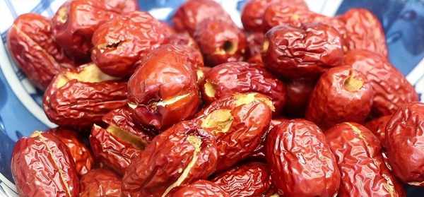 用剪刀把红枣从中间剪下来,再用剪刀剪掉里面的核,然后把红枣倒入开水里,压紧碗,让红枣泡发。