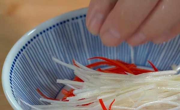 用刀打一些大蒜,切成蒜泥,从中间切一个大红辣椒,然后换刀切成细条,大葱去掉硬核,再切成细条,把它们放在一个小碗里放在一边。
