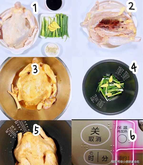 做法;1.从鸡肚子开边处理,不砍断,清洗内脏:2.将鸡放入容器,加入花生油,生抽,老抽,胡椒粉,盐焗鸡粉,用调料将鸡涂抹均匀,整只鸡包括里面!腌制2到3小时。3.在电饭煲里面铺上葱姜蒜,将鸡整只放入电饭煲,倒入腌制用的酱汁,切记想要鸡够香,不要加水!4.电饭煲煮饭模式30分钟,再保温20分钟焖煮一下,焖的时候不要开盖。注意:完成后,要筷子戳一下鸡,看看熟了没,没熟就继续煮一下。