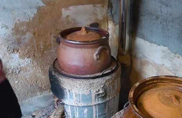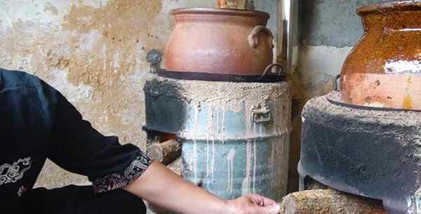 第五步,将包好的鸭子放入装有月桂叶、八角等香料的巨大瓦煲中,最后倒入老卤汁,用柴火炖3小时。
