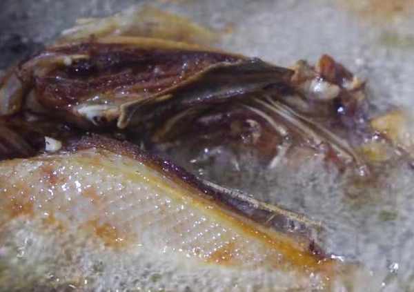 第三步,将煮熟的鸭子放入锅中炸至金黄。