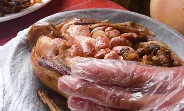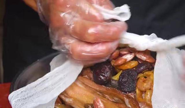 第四步,把煮熟的五花肉切成均匀的小块塞进鸭肚里,再往鸭肚里塞些海蛎干、墨鱼干、虾米、香菇、蚕豆等调料,塞满是的,在鸭子外面裹上一层纱布,用力挤压把鸭子包起来。
