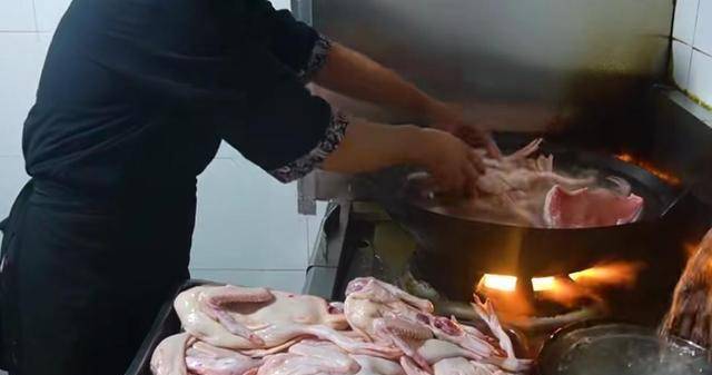 第二步,将鸭子拔毛,去内脏,洗净,入冷锅中煮至鸭子变色,脏物熟透。一大块五花肉和鸭肉同时煮熟。