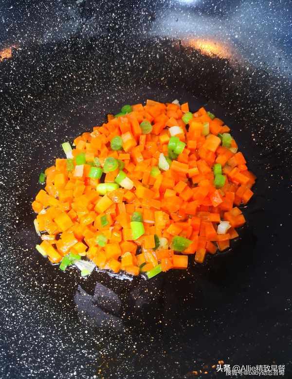 锅内倒入更多的油,倒入蒜清炒香,再倒入胡萝卜炒软。