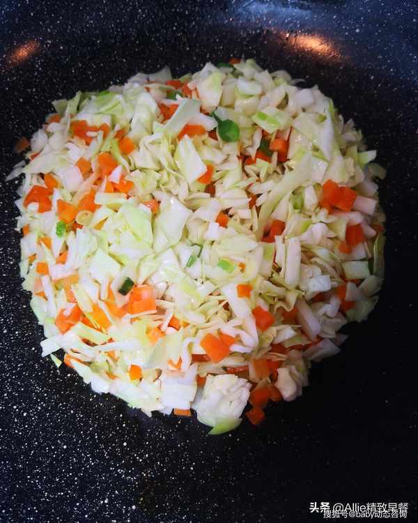 胡萝卜切丁,卷心菜切小块,白洋葱和大葱分别切备用,打两个鸡蛋。