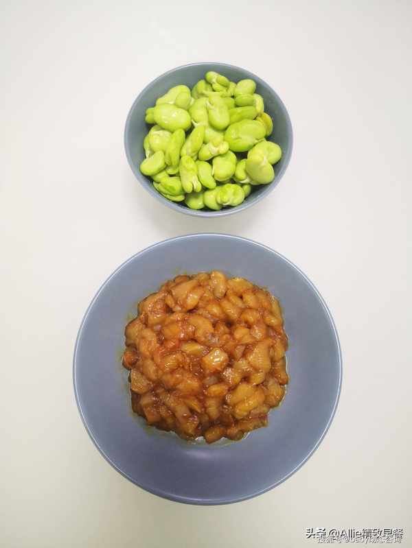 另一锅倒少许油,倒入葱花炒香,倒入蚕豆,翻炒几下,加入约半碗水,加少许盐,将蚕豆煮熟软的,如果蚕豆比较老,水要多加一些,以免出汤。汁煮干豆不软。