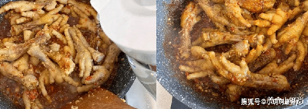 闻到香气后,放入洗干净晾干水的鸡爪,翻炒两下,再加入一勺生抽,一勺老抽,一勺盐,一勺糖,翻炒均匀后倒入适量的开水,煮6到7分钟,大火烧水收成汁。