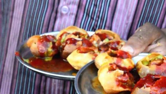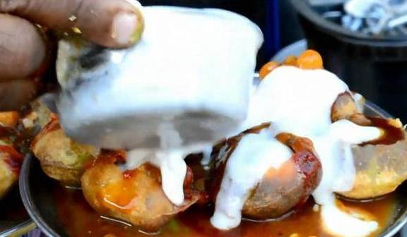 小饼炸好之后,小吃摊老板在小饼的顶端用左手敲个小洞出来,把提前用西红柿、红椒、土豆泥和咖喱一起炖成的咖喱蔬菜汤淋在这些在小洞里。咖喱可是印度人最爱的调料品之一了,不管是做主食也好,甜食也好,他们都要放咖喱的,哪怕是吃个酸芒果,也喜欢用咖喱蘸着着,他们对咖喱非常钟爱。