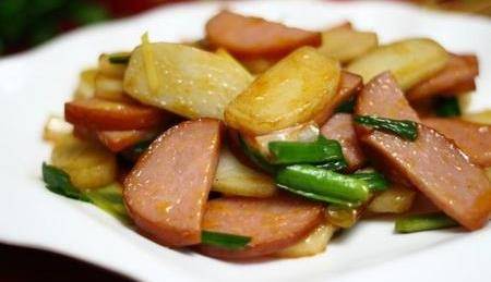 3.锅内热油,加入葱花爆炒出香味,加入老干妈翻炒,再将火腿、胡萝卜、洋葱丝放入锅中翻炒。