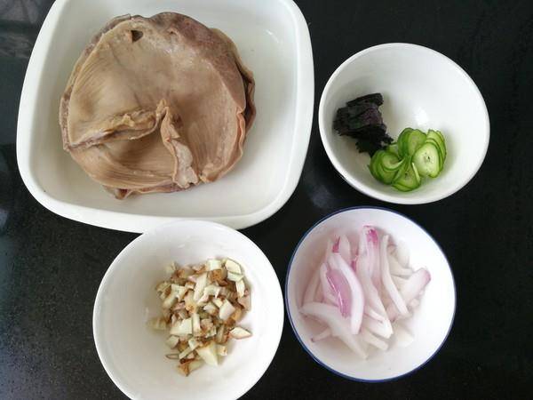 猪肚 1个、沙姜 20克、洋葱 20克、黄瓜 15克、麻油 15克、紫苏叶 5克、酱油 20克、蚝油 10克