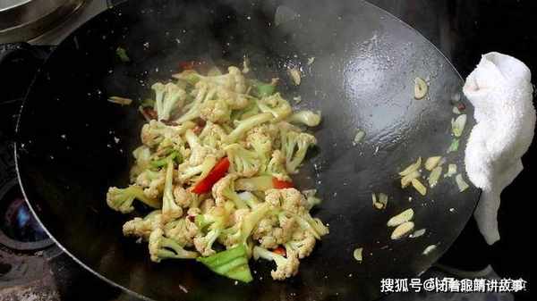淋入生抽5克,加入食盐2克,鸡粉1克,胡椒粉1克,白糖少许,保持大火快速翻炒给花菜入味。