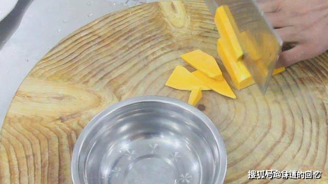 南瓜取一小块,去皮后切成片。