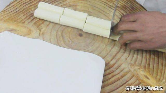 此菜用铁棍山药最佳,蒸出来更软。山药两根,洗净削皮,切成三厘米长的段,码放整齐。盘。中。