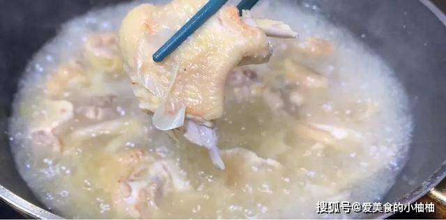 4.烧一锅开水,然后用勺子一点点浇到鸡皮上,鸡皮遇热后迅速紧缩。