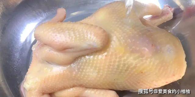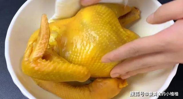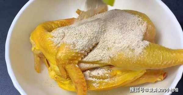 1.鸡肉选用新鲜肥美的三黄鸡,处理好之后,先用食盐给它按摩一遍。