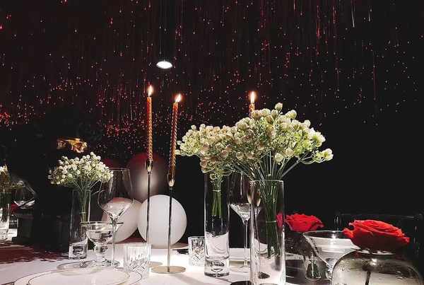 成都万达瑞华推出有几个种类的套餐,最有仪式感的是3999元的双人臻选套餐,准备有香槟、香水、小提琴和钢琴现场演奏,还有巧克力与玫瑰以及用餐环境布置,氛围感十足。
