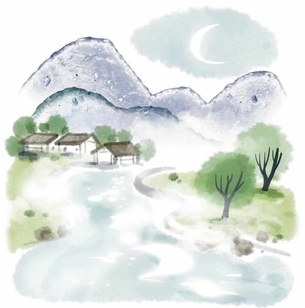 登了一天的山,倦了。我俩坐在竹凳上,挑两个木桶,也去盛些温汤,把双足放入温热的泉水中,暖意从足底涌上。此刻,水面上映着一轮圆月,我抬头一看,明月正踏过青山,清朗而纯净,含笑走来。