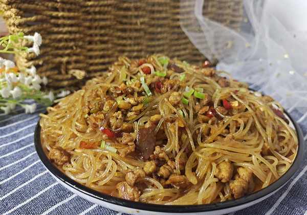 4、加入泡好的粉丝,翻炒均匀后转小火炖3分钟,至粉丝入味即可捞出。具体时间要看粉丝粉的粗细,不要炒粘。