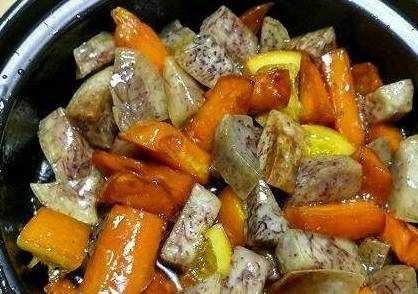 熬甜芋,芋头一个,番薯一个,千万不要多,不然翻起来好费劲,番薯芋头洗净切块,锅里留少许油,放入白糖红糖和少许水熬成糖浆,将番薯芋头倒入,翻炒,加水至刚好淹没番薯芋头,熬制至收汁,即可!如果喜欢甜,就加多点糖。(ps:收不了汁证明糖少了)