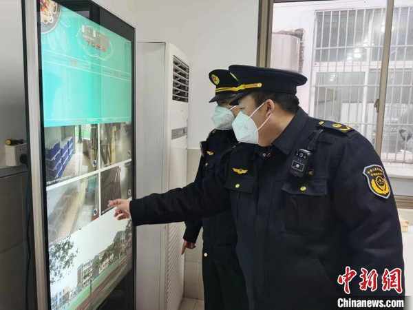 青浦区市场监管局执法人员查看青浦区实验小学食堂明厨亮灶视频监控系统。 上海市市场监管局供图