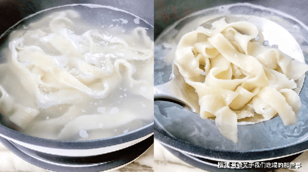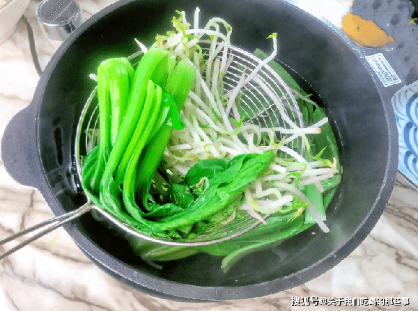 3、烧一锅开水,放入扯好的面条,煮2分钟,熟透后捞出过凉水,沥干水分后放入碗中备用。油菜、豆芽放入煮面条的水中烫1分钟,捞出放在碗底,然后倒入面条。