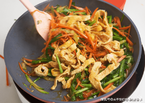 4、锅里留底油,烧热后倒入韭菜、胡萝卜丝,大火翻炒至断生,倒入鸡蛋条,加入适量食盐、生抽炒匀后关火。用饼皮卷上合菜、黄瓜丝、葱丝,卷起来就可以吃了。