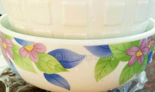 7.然后用重物压在纱布包好的咸菜上家里实在没啥沉的东西就用这两个大碗装满水压着然后把咸菜放在厨房水池旁边下面铺了个塑料袋当引流再让咸菜有些倾斜度这样压出的水就直接流到水池里了