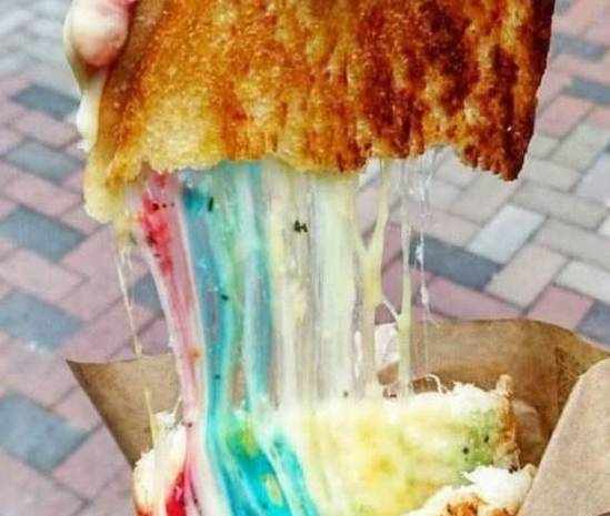 这是网红彩虹吐司了,是用能食用的颜料把吐司染成彩虹的样子,然后掰成两半就可以看到像这样的彩虹了,其颜值深受小仙女们的喜欢。不过味道跟普通的吐司没什么两样。