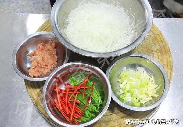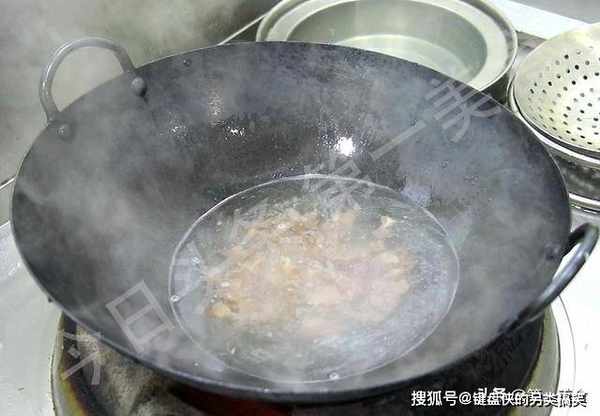 2.开始烹饪:锅内烧油,充分滑锅以后倒出热油加入凉油,热锅凉油炒肉时不容易粘锅,倒入肉丝快速翻炒,肉丝炒变色、炒出香味以后倒入葱姜丝翻炒出葱香味,