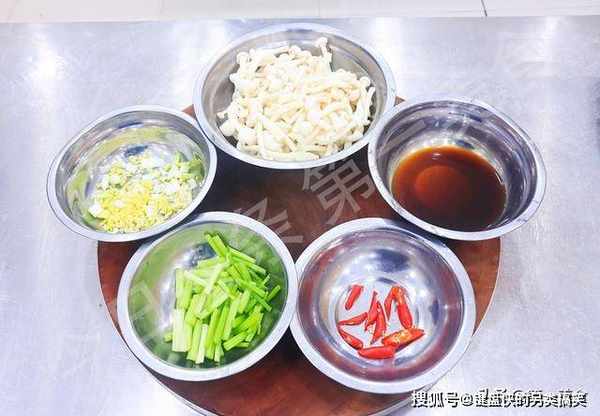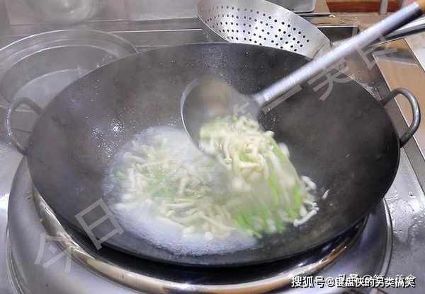,水烧开以后把白玉菇倒入锅中,焯水40秒钟,再放入小香芹继续焯水10秒钟后倒出来,