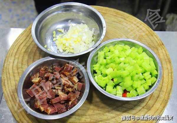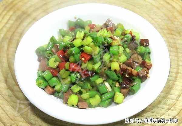 增鲜,翻炒均匀给配菜入味,倒入腊肉粒翻炒几下,从锅边