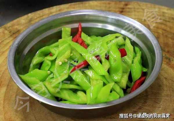 ,清洗干净,去籽后轻轻拍几下,斜刀切成条,喜欢吃辣的可以换成螺丝椒。